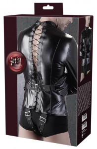 Straitjacket με ρυθμιζόμενους ιμάντες πάνω από τον καβάλο. Τα εξαιρετικά μακριά μανίκια έχουν επιπλέον αγκράφες. Υπάρχει ένας πρόσθετος ιμάντας για τους βραχίονες στο μπροστινό μέρος για να τους στερεώσετε στη θέση τους. Η σύσφιξη μπορεί επίσης να ρυθμιστεί με το κορδόνι πλήρους μήκους στο πίσω μέρος.