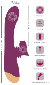 Άνετη διπλή διέγερση! Ο εύχρηστος 2 Λειτουργικός Δονητής με το Moving Clitris Tickler από την Javida παρέχει ταυτόχρονα εσωτερική και εξωτερική απόλαυση! Παρέχει βαθιά κολπική και G-spot διέγερση, χάρη στον καμπύλο φρεάτιό και το αηδιαστικό vibro-head. Το μαλακό, διακεκομμένο, εύκαμπτο vibro-arm παρέχει κηλίδες διακόσμησης. Κινείται ρυθμικά μπρος-πίσω (κίνηση) αλλά πάντα χτυπάει το σημείο. Διπλή δύναμη οργασμού στο πάτημα ενός κουμπιού! 8 Τρόποι δόνησης. Οι δονήσεις και η κινούμενη λειτουργία μπορούν να ελεγχθούν μαζί ή ξεχωριστά.